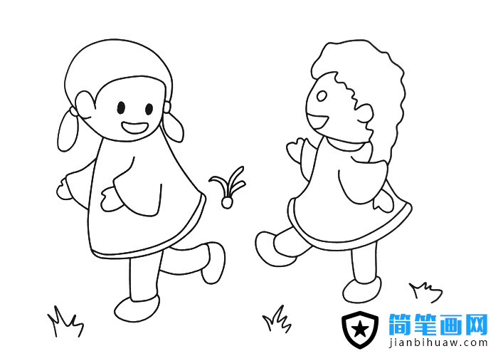 兩位小朋友在玩踢毽子游戲的簡筆畫圖片